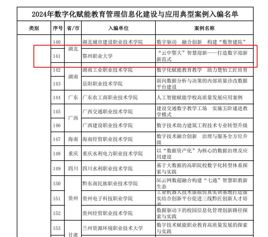 本网讯(通讯员 刘思思)12月5日,教育部教育管理信息中心公布了2024年数字化赋能教育管理信息化建设与应用典型案例名单,我校报送的《“云中鄂大”智慧迎新——打造数字迎新新范式》案例成功入选。全国范围内共评选出职业院校教育管理信息化建设与应用典型案例40项,湖北省有2所职业院校典型案例入选。