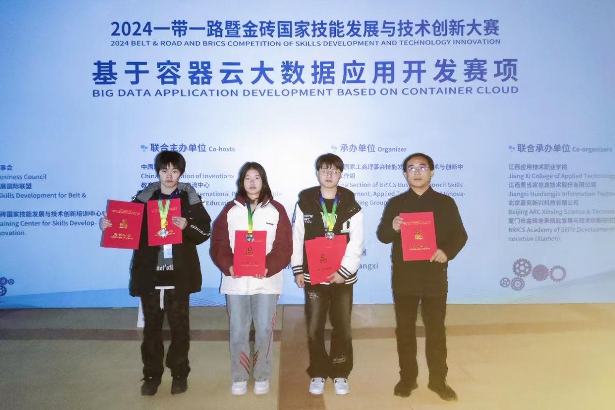 12月15至16日,在江西赣州举行的“一带一路暨金砖国家技能发展与技术创新大赛-基于容器云大数据应用开发赛项”全国总决赛上,信息工程学院学生曾俊豪、裴锦程、周琪组成的代表队荣获全国总决赛“银牌”(全国二等奖),鄂州职业大学获优秀组织奖。