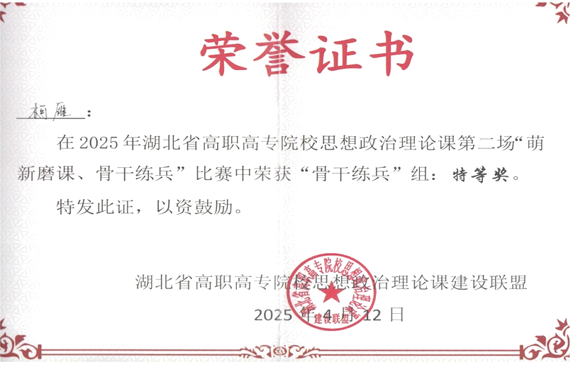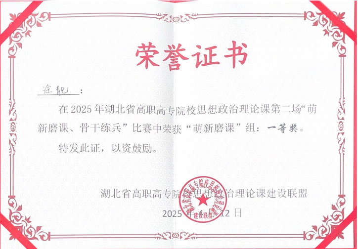 本网讯(通讯员 柯雁)近日,2025年湖北省高职高专院校思政课“萌新磨课·骨干练兵”教学展示活动第二场比拼圆满落幕。我校马克思主义学院教师表现优异,涂靓老师荣获“萌新磨课”组一等奖,柯雁老师摘得“骨干练兵”组特等奖。