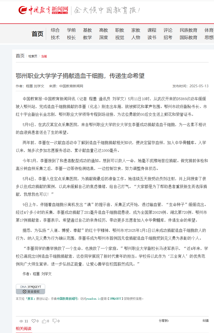 中国教育报——鄂州职业大学学子捐献造血干细胞,传递生命希望