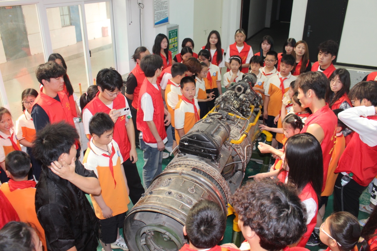 在航空工程学院师生的热情讲解下,小学生们分组参观了航空发动机展示区、模拟驾驶舱等实训区域。