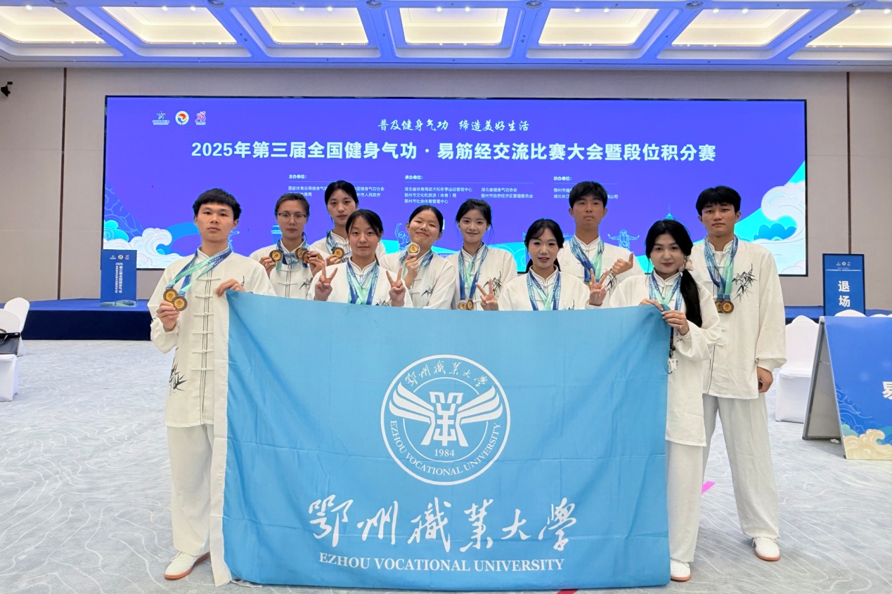 本网讯(通讯员 程斌鹏)6月1日,2025年第三届全国健身气功·易筋经交流比赛大会暨段位积分赛在湖北鄂州国际会展中心落下帷幕。我校代表队在此次国家级赛事中表现优异,共获得集体二等奖1项、集体三等奖6项、个人二等奖2项和个人三等奖1项。