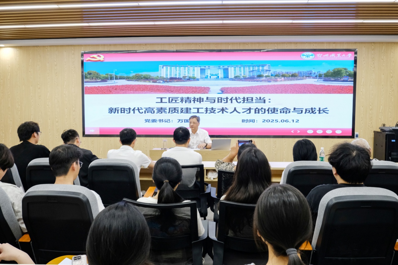 本网讯(记者 何建华)6月12日下午,校党委书记万国光以“工匠精神与时代担当——新时代高素质建工技术人才的使命与成长”为题,为建筑工程学院师生讲授专题思政课。课程深入剖析建筑行业发展趋势,探讨了新时代建工人才的培养路径,激励青年学子以工匠精神赋能职业成长,在服务国家战略中实现人生价值。
