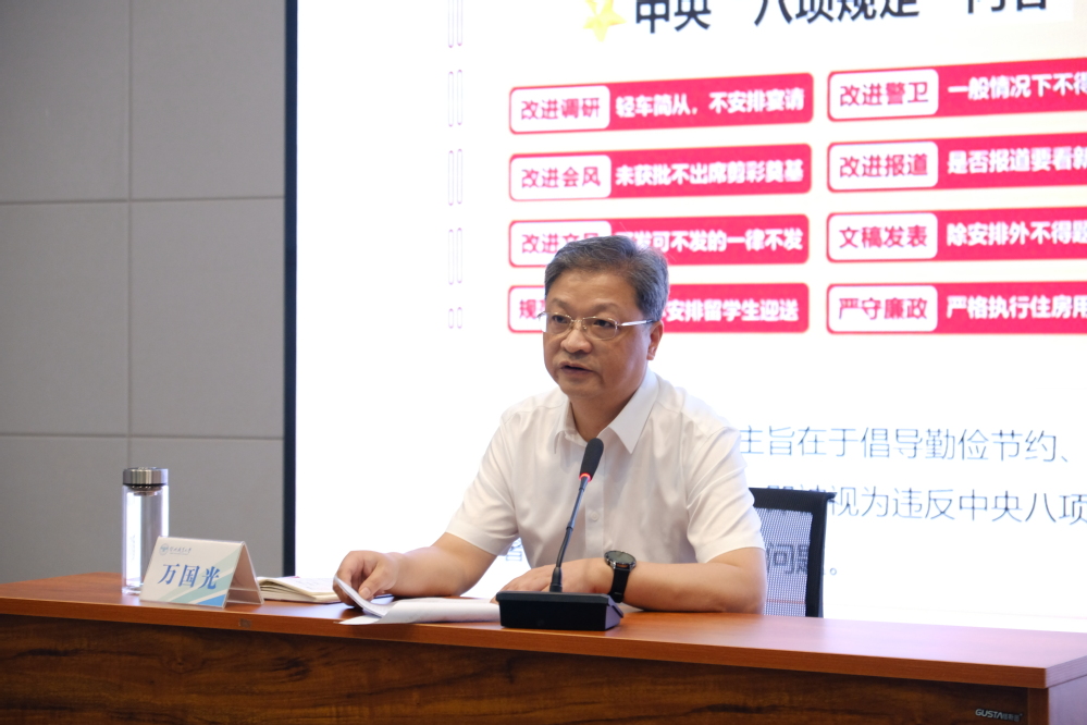 万国光在授课中指出,中央八项规定是党中央在新时代推进全面从严治党的关键一步,是改进工作作风的“徙木立信”之举,其核心是通过改进工作作风反对形式主义、官僚主义、享乐主义和奢靡之风,倡导务实廉洁的作风。在详细阐释中央八项规定与“中央八项规定精神”的区别时,万国光结合历史经验,回顾了“延安作风”战胜“西安作风”的深刻启示,指出中央八项规定是党以“小切口”推动“大变局”政治智慧的展现,更是新时代党的自我革命、赢得民心的关键。