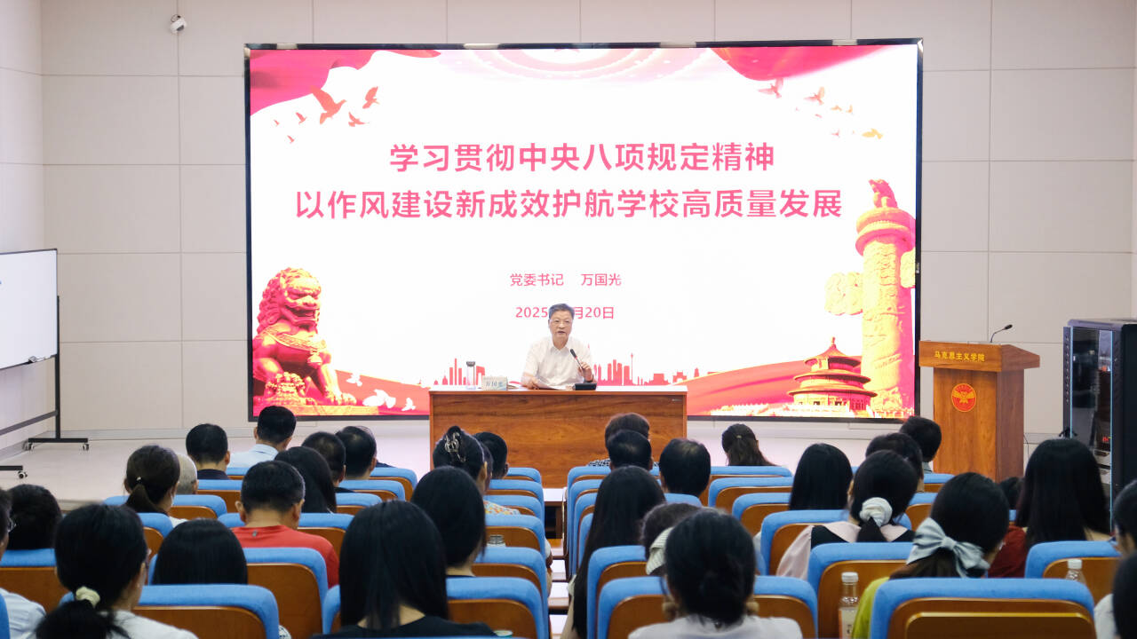 本网讯(记者 何建华)6月20日,校党委书记万国光在马克思主义学院以“学习贯彻中央八项规定精神 以作风建设新成效护航学校高质量发展”为题,讲授了一堂深刻而生动的党课。马克思主义学院、建筑工程学院及机关一支部教师共同聆听了此次课程。
