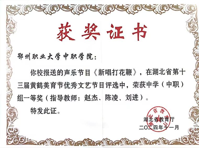 近日,湖北省第十三届黄鹤美育节优秀文艺节目评选结果揭晓,鄂州职业大学中职学院原创表演唱节目《新唱打花鞭》从全省1500个参赛作品中脱颖而出,荣获一等奖。这一成绩不仅是学校美育教学的里程碑式突破,更是传统文化创造性转化的生动实践。