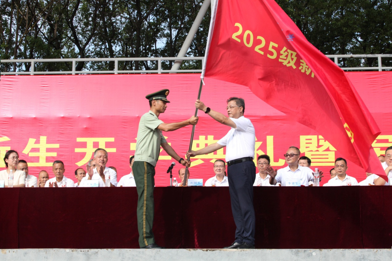 最后,校党委书记万国光向承训部队授旗并庄严宣布:“2025级学生军训正式开营!”铿锵之音落下,新生们的迷彩青春正式启幕。他们将在接下来的训练中淬炼品格、磨砺意志,以汗水为墨,以迷彩为卷,书写大学生涯的第一篇华彩乐章。