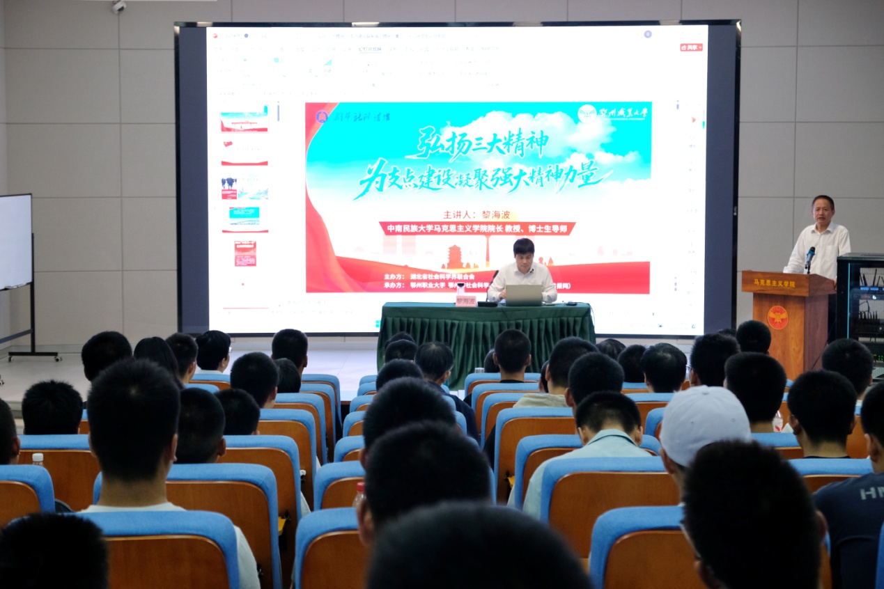 本网讯(记者 何建华)9月25日,“弘扬三大精神”荆楚社科讲坛在鄂州职业大学举行。讲坛由省社科联主办,鄂州职业大学、市社科联、荆楚网(湖北日报网)联合承办。省委宣讲团成员、中南民族大学马克思主义学院院长、博士生导师黎海波教授应邀作专题宣讲。校党委副书记王家绪主持报告会。