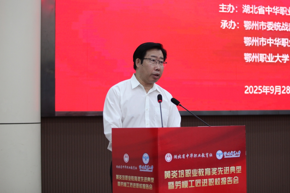本网讯(记者 缑非凡)为积极引导广大师生传承弘扬劳模精神、劳动精神、工匠精神,为支点建设贡献职教智慧和力量,9月28日下午,由省中华职教社主办,市委统战部、市中华职教社和我校联合承办的黄炎培职业教育奖先进典型暨劳模工匠进职校报告会在我校图书馆二楼报告厅举行。