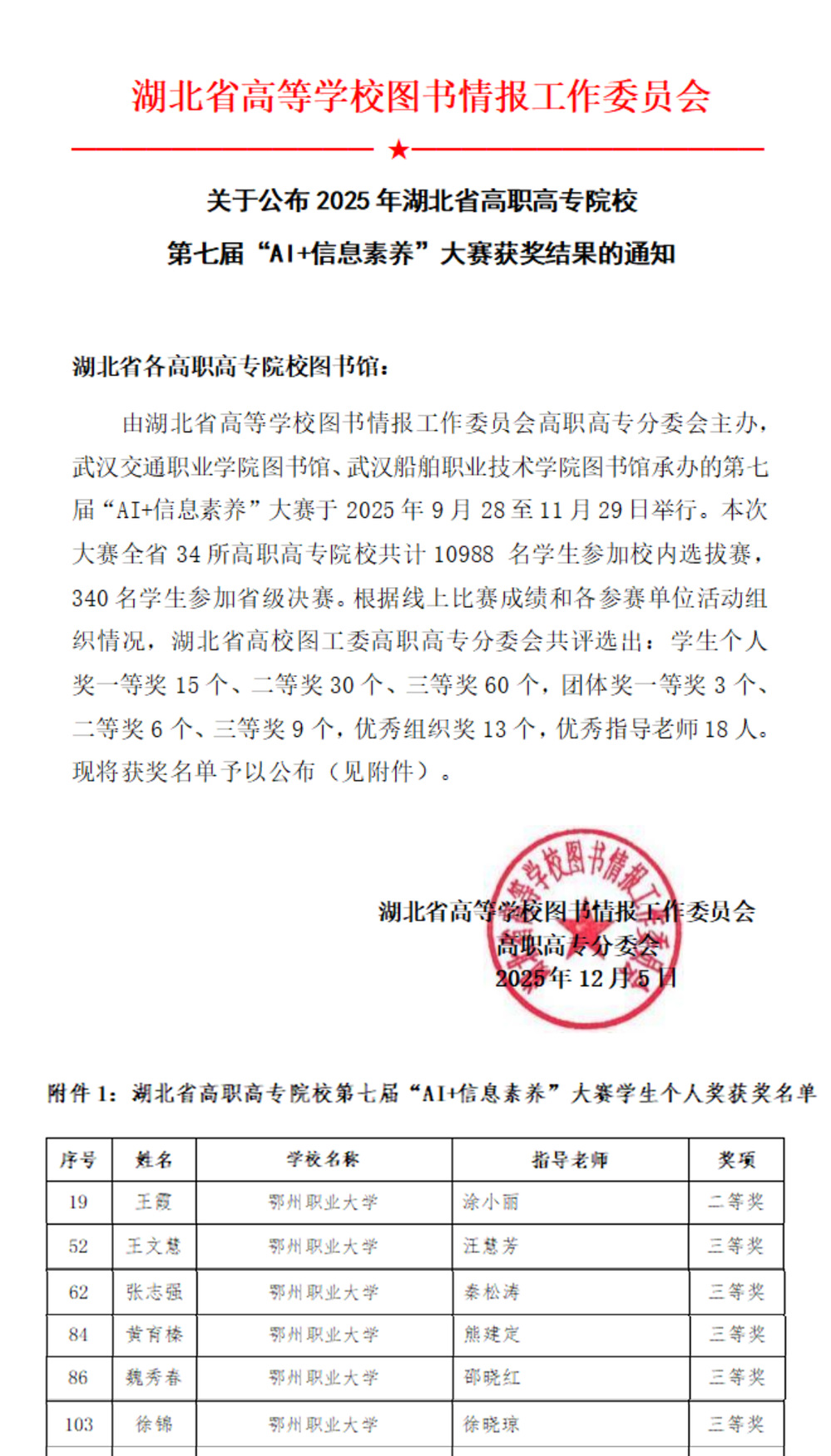 本网讯(通讯员 涂小丽)近日,由湖北省高等学校图书情报工作委员会高职高专分委会主办的2025年湖北省高职高专第七届“AI+信息素养”大赛圆满收官。我校代表队从全省34所院校的万余学子中脱颖而出,荣获团体总分第二名。经过校赛选拔晋级省赛的10名选手中,1人荣获二等奖,5人获得三等奖,充分展现了我校学子扎实的信息素养与昂扬奋进的竞赛风采。