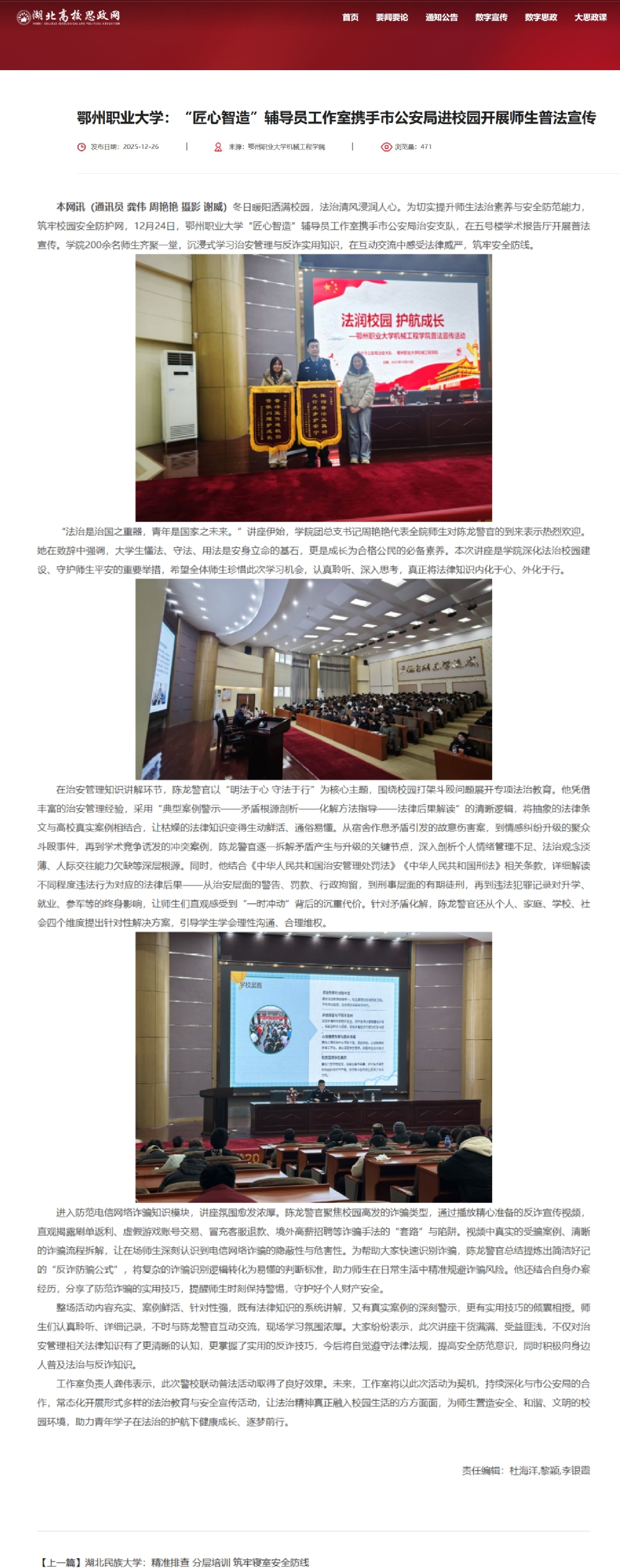 湖北高校思政网——鄂州职业大学:“匠心智造”辅导员工作室携手市公安局进校园开展师生普法宣传