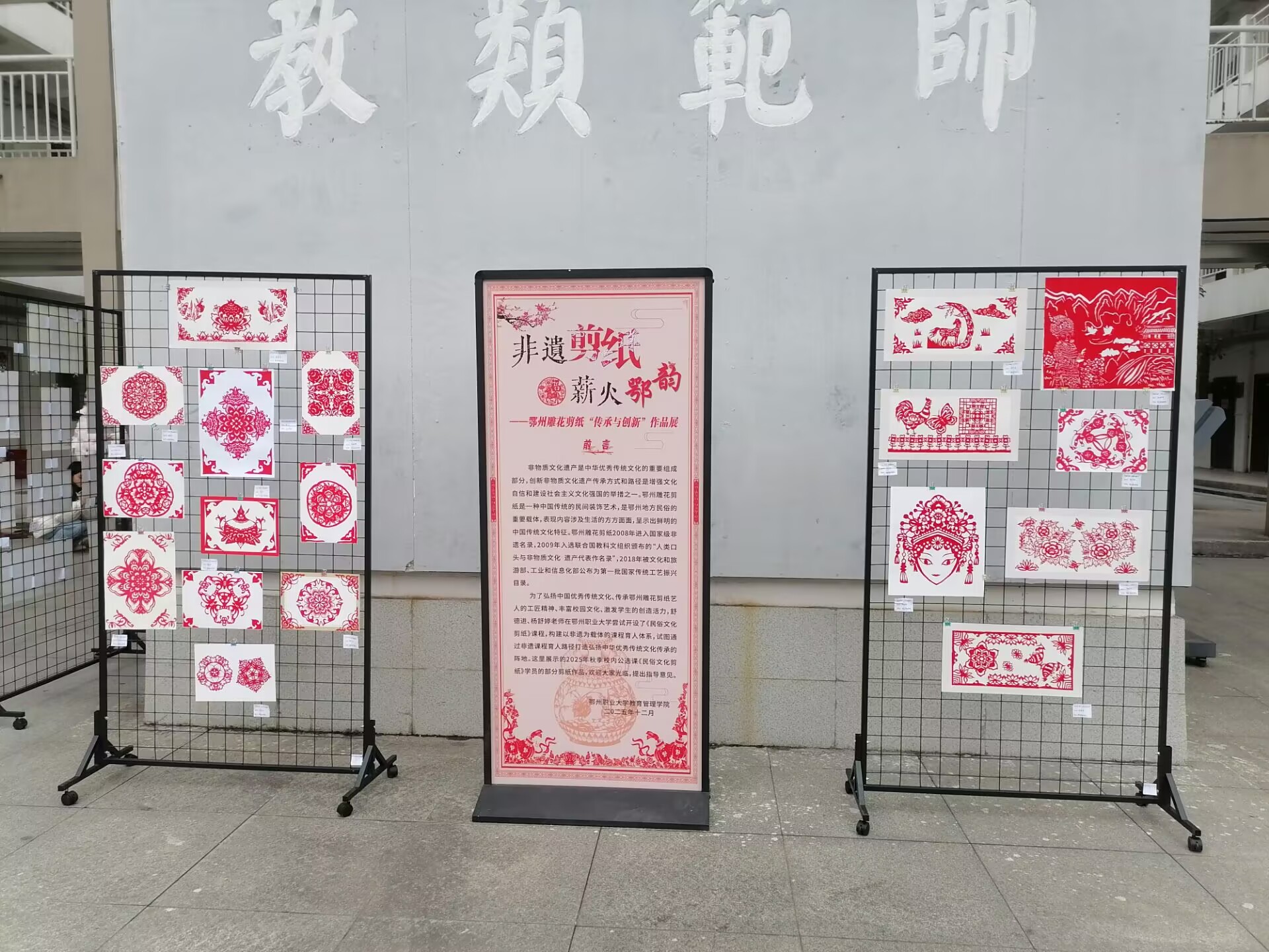 本网讯(通讯员 茅芮)近日,教育管理学院举办“传承与创新”鄂州雕花剪纸作品展,集中展示2025年秋季民俗文化剪纸公选课学生的优秀作品。作为国家级非物质文化遗产,鄂州雕花剪纸通过校园展览形式,体现了课程教学的扎实成效,成为推动非遗在青年群体中薪火相传的重要载体。