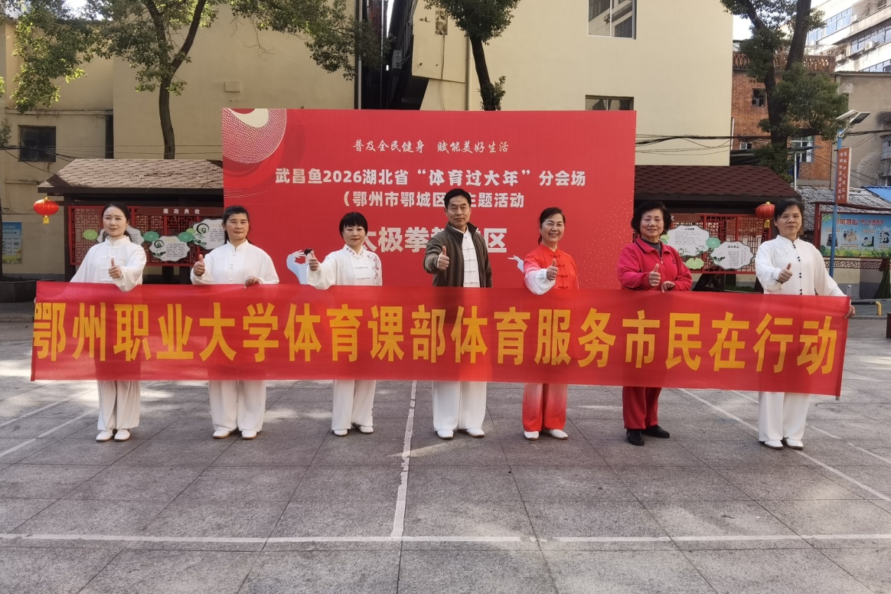本网体育课部消息 正月初五春意浓,全民健身正当时。2月21日,我校体育课部紧扣“‘五红’培根铸魂,笃行‘全体’育人”党建品牌与国家级“一校一品”“传统五项 四维育人”体育育人品牌建设要求,组织8名专、兼职教师深度参与2026年湖北省“体育过大年”鄂州市鄂城区系列活动,以传统体育展演与公益教学的形式,将专业体育力量送至公园、扎根社区。