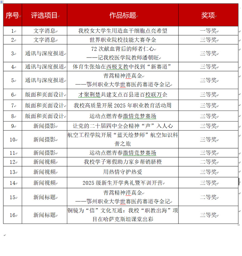 本网讯(记者 何建华)近日,2025年度湖北高校新闻奖评选结果揭晓。我校在此次评选中再获佳绩,共有16件新闻作品获奖,其中一等奖1项、二等奖2项、三等奖13项,获奖数量创历史新高。