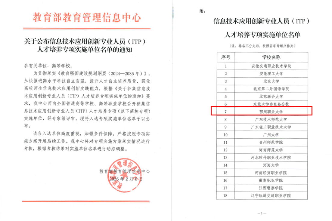 本网讯(通讯员 杨婷))近日,教育部教育管理信息中心公布“信息技术应用创新专业人员(ITP)人才培养专项”实施单位名单,我校成功入选全国首批30所实施高校之一。