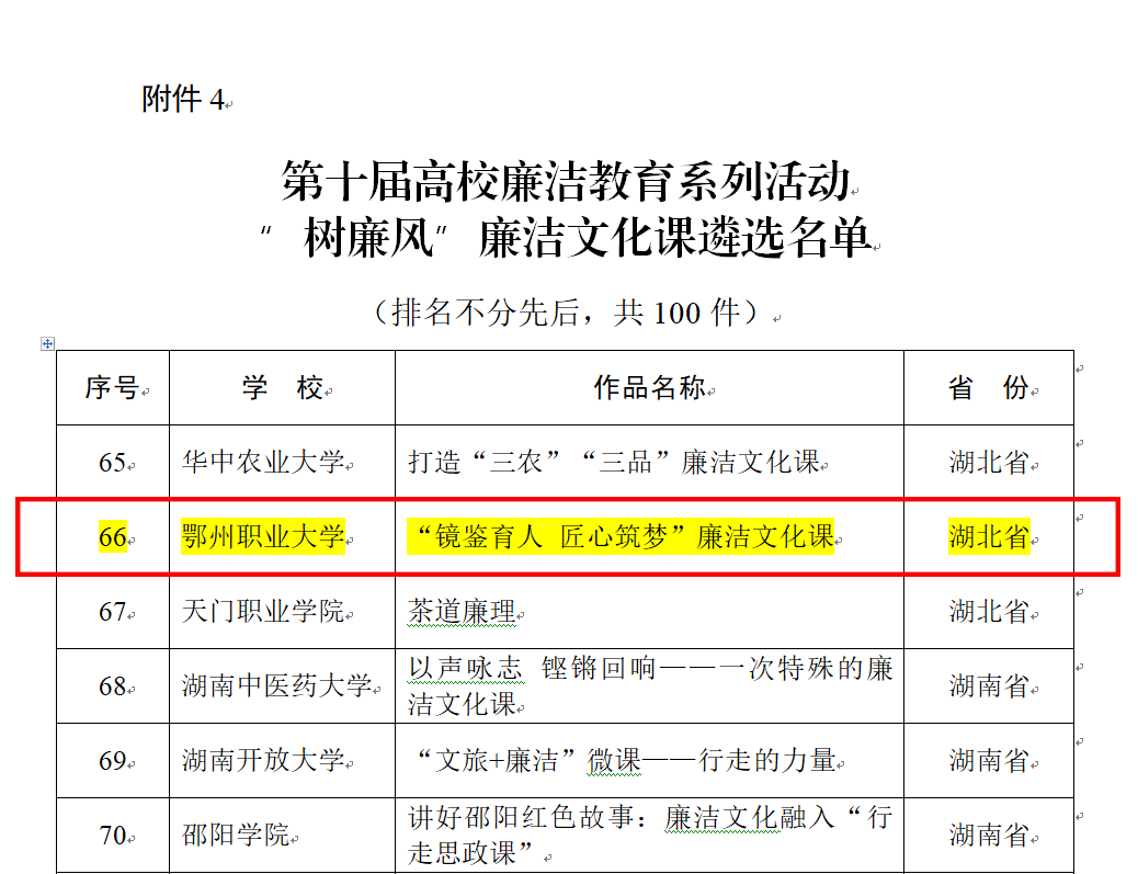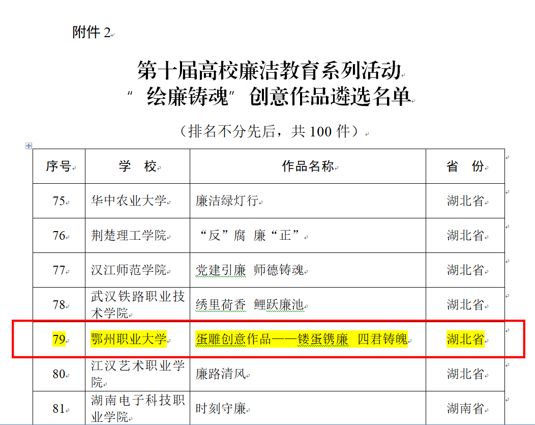 本网讯(记者 何建华)近日,教育部办公厅公布第十届高校廉洁教育系列活动评选结果,我校申报的2个作品入选优秀作品名单。其中,“蛋雕创意作品——镂蛋镌廉 四君铸魄”入选“绘廉铸魂”创意作品名单,《“镜鉴育人 匠心筑梦”廉洁文化课》成功入选“树廉风”廉洁文化课优秀作品。