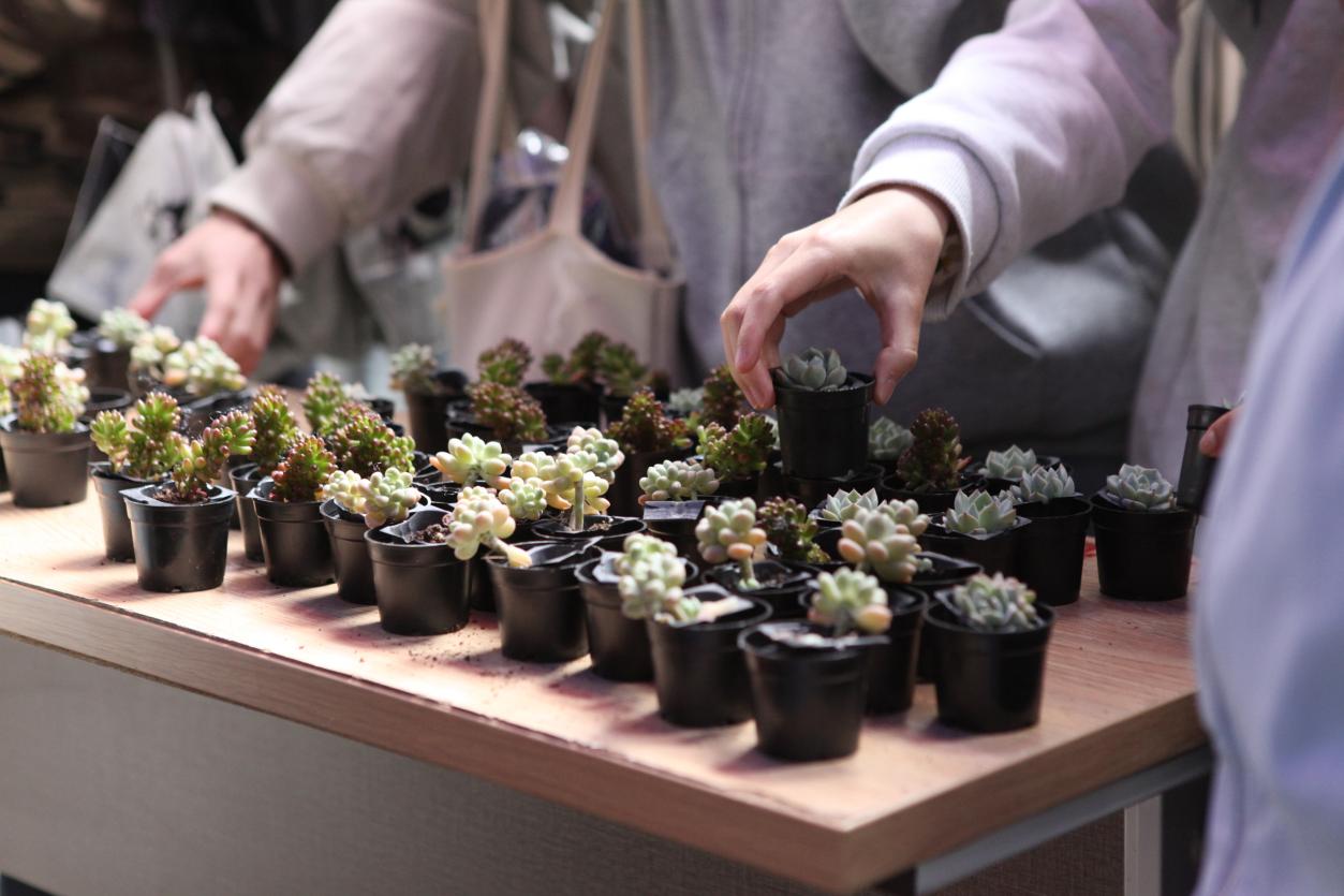 碧桃、虹之玉、青柠珍妮……活动现场,多款多肉绿植晶莹剔透、排列整齐,即将迎来新的主人。同学们在引导下有序扫码参与,满心欢喜地挑选自己最心动的那抹青绿。一旁的志愿者们还贴心地为第一次领养多肉的同学普及养护常识,送上铲子、喷壶等工具。不到一个小时,150份绿植和40份种子已被师生领养一空。25级空乘一班林宛铮同学说:“我从小就喜欢花花草草,它们蓬勃的生命力给人积极向上的力量,希望大家都为周边的环境增添一抹新绿。”