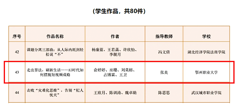 本网讯(通讯员 张炎)近日,由教育部思想政治工作司指导、普通高等学校学生心理健康教育专家指导委员会主办、中国大学生在线承办的第二届全国高等学校心理健康教育微课征集展示活动遴选结果公示。我校学生微课作品《走出算法,刷新生活——AI时代如何摆脱短视频成瘾》从全国2806件参赛作品中脱颖而出,成功入选。