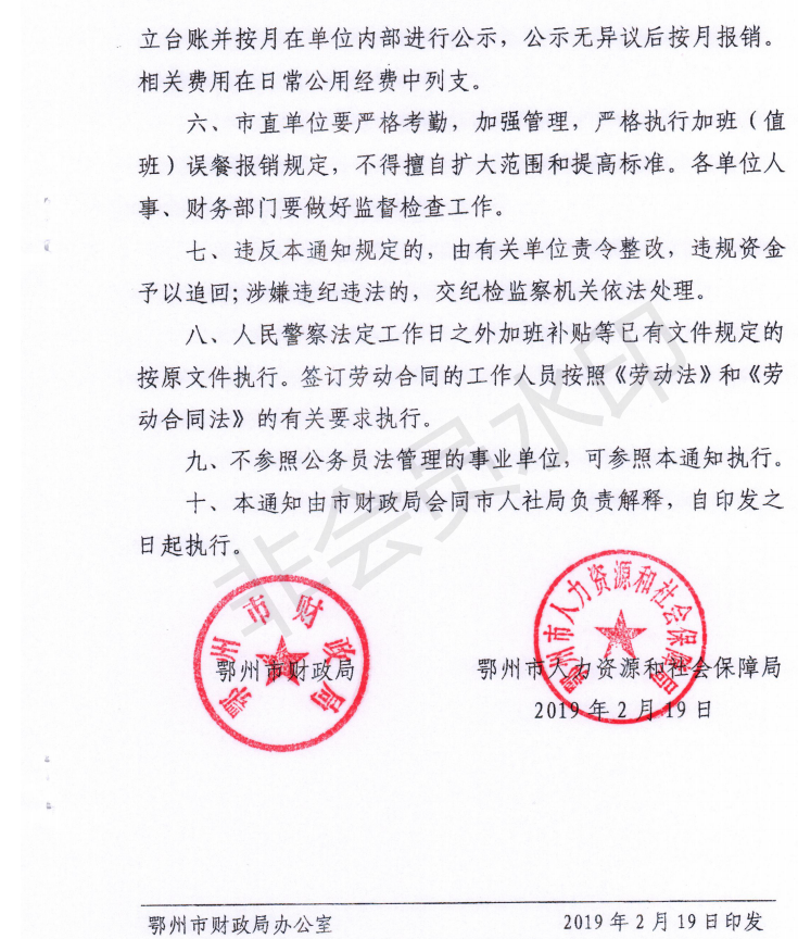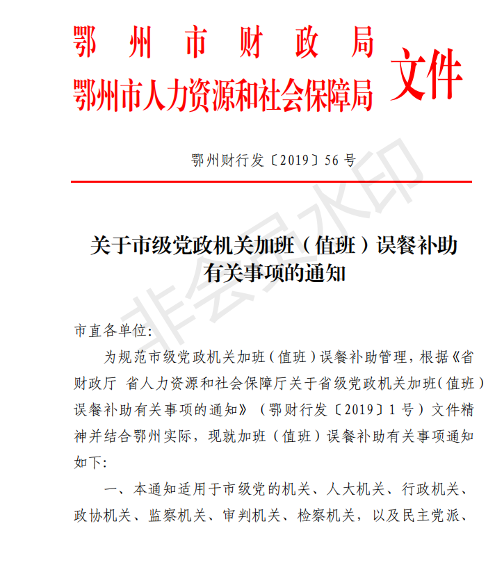 鄂州市财政局、鄂州市人社局关于《市级党政机关加班(值班)误餐补助有关事项的通知》