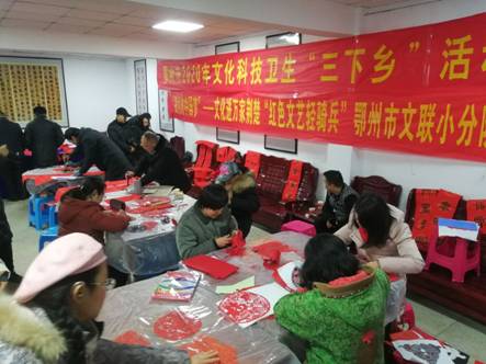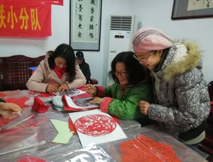 (本网讯)2020年1月22日上午,我院杨舒婷老师随荆楚"红色文艺轻骑兵"鄂州文联分队的艺术家们在张裕钊文化园书联剪纸,为沼山镇村民送上新年祝福。 活动现场杨舒婷老师的剪纸作品引起了其他市内剪纸协会会员的兴趣,大家一起交流技艺,她即兴剪了几幅作品,送给了附近村民。本次活动旨在丰富基层群众的文化生活,推动精准扶贫工作的深入开展。