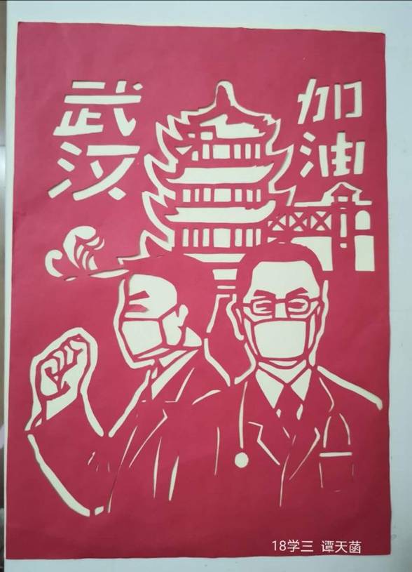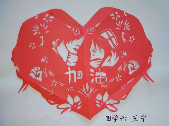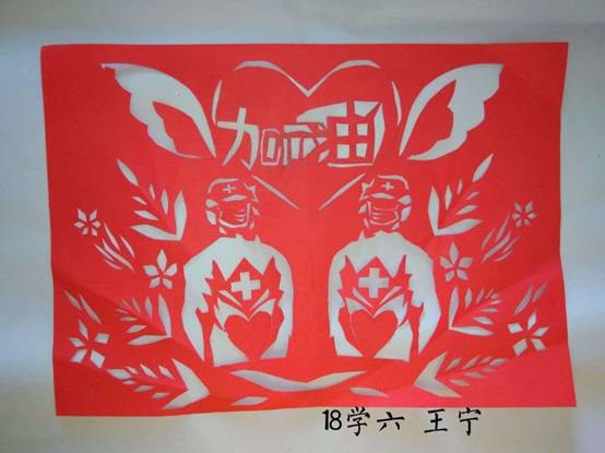 (本网讯)2018级学前教育专业学生王宁、谭天菡同学利用在我院剪纸雕花大师工作室所学的剪纸技巧尝试创作了多副剪纸作品,其中一幅画面素材来源于抗疫一线新闻,主要设计了2名穿着厚重防护服的医护人员,头顶插翅爱心和加油字样,寓意主要表达对一线抗疫医护人员的崇高敬意,并借此作品将抗疫信心传达出来,鼓舞人心。