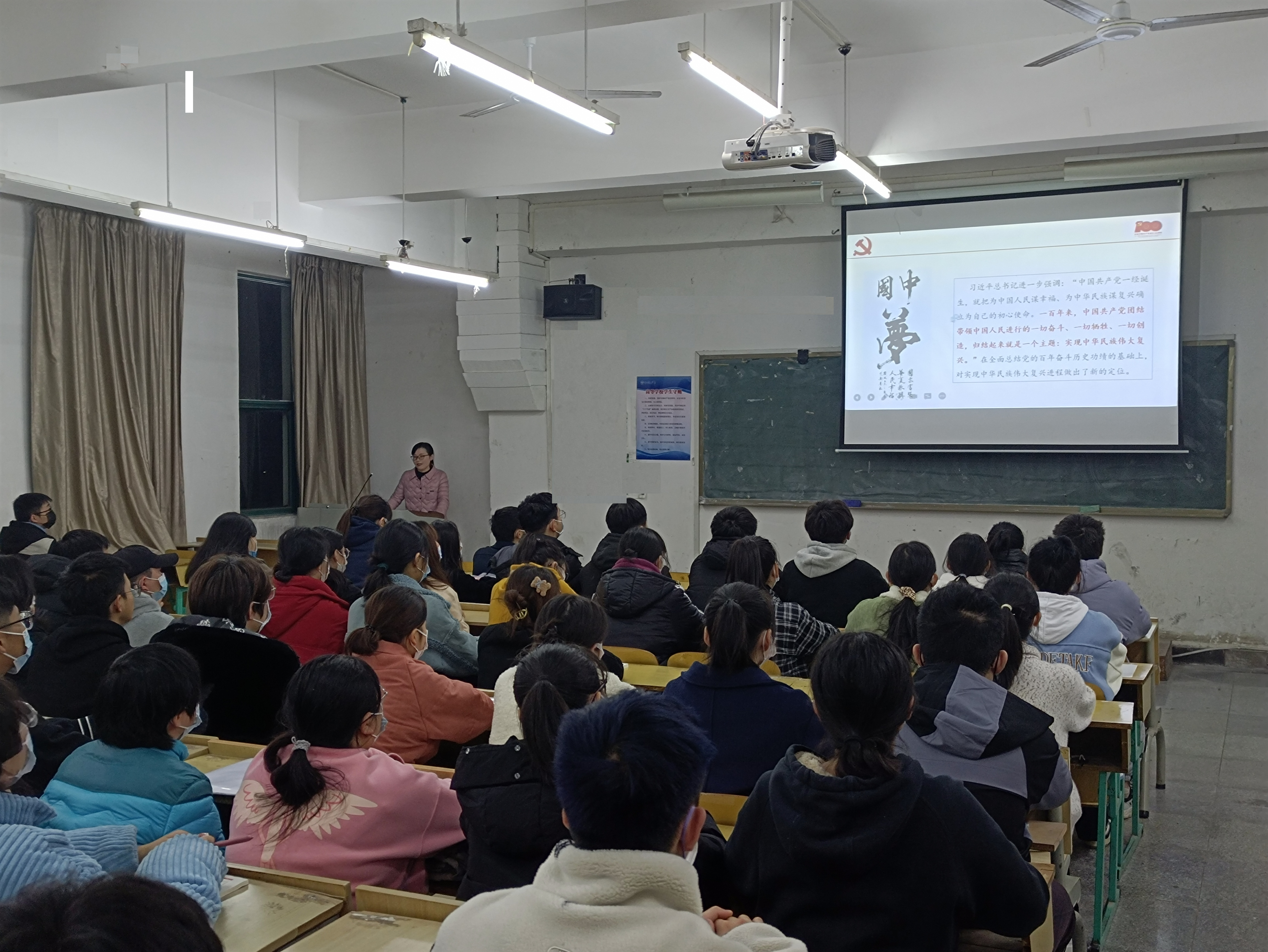 陈丽娟老师以《学习“七一”讲话精神,汲取砥砺奋进力量》为主题,围绕“七一”讲话主要内容、深刻领会伟大建党精神、不负总书记殷切期望,勇担民族复兴重任等三个方面展开宣讲。生动阐述了中国共产党百年奋斗的目标和主题、取得的四个伟大成就和四个庄严宣告,重点讲解了“坚持真理、坚守理想,践行初心、担当使命,不怕牺牲、英勇斗争,对党忠诚、不负人民”伟大建党精神的内涵,系统解读了总书记在讲话中总结的九个必须,并呼吁同学们响应总书记号召,增强做中国人的志气、骨气、底气,不负时代,不负韶华,负党和人民的殷切期望!