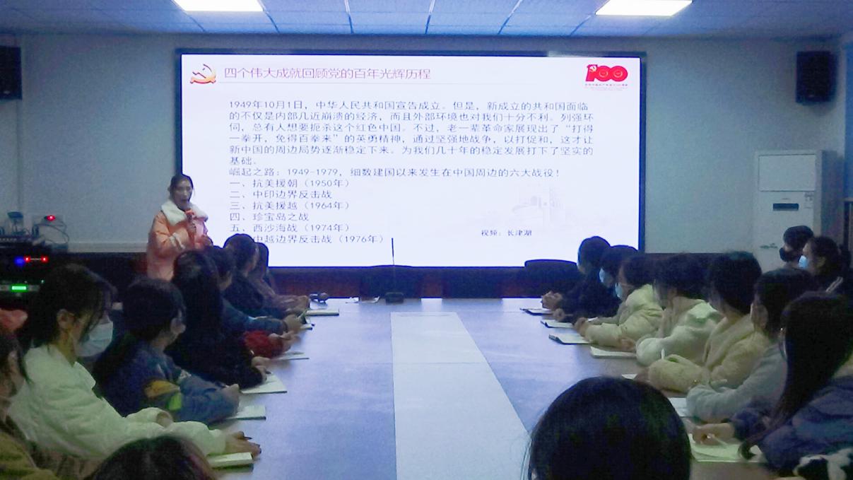 随后何青老师从整体到部分来具体的讲解了习近平总书记“七一”重要讲话内容,从“四个伟大成就和四个庄严宣告”见证了中国共产党的光辉历程,从“九个必须”总结了中国共产党在百年奋斗中积累的宝贵经验。何青老师在这中间穿插了“长津湖”、“吾辈许国”、“一艘小船见证开天辟地的大事变”等多个小视频,并结合时事通过孟晚舟回国事件来进行评价,祖国日渐强大,是先辈们从风雨中走来,倒在了泥泞中为我们送来了光明,已经没有任何力量能够阻挡中国前进的步伐。