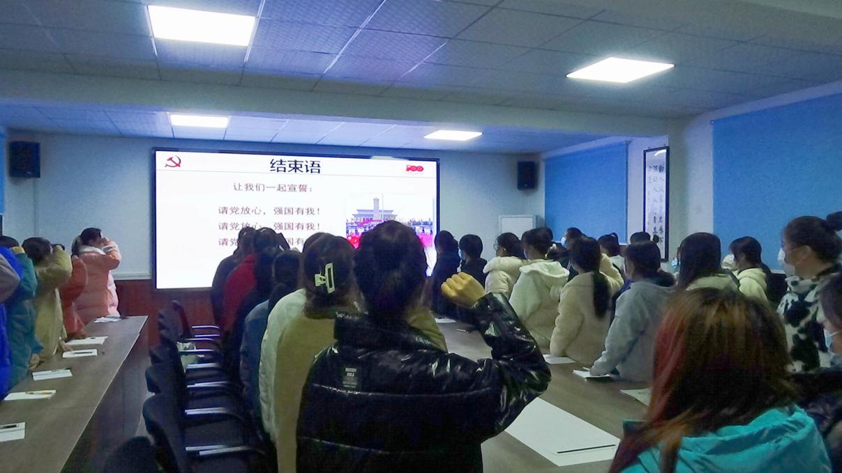 最后,何青老师对宣讲进行了总结对同学们进行了殷殷嘱托:“同学们,你们作为鄂大青年学子,是新时代中国青年的一员,立足百年未有之大变局和中华民族伟大复兴战略全局的时代背景,要将伟大建党精神转化为我们前进的强大动力,努力在党和人民需要的地方发光发热、倾尽全力、奉献所有!”在何青老师的带领下,全体同学起立,庄严的执起右手,“请党放心,强国有我! 请党放心,强国有我!请党放心,强国有我!” 宏亮的声音响彻会议室,其中饱含了同学们对先辈的缅怀,对祖国的热爱,对未来的期待。