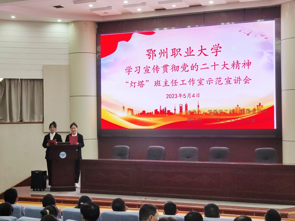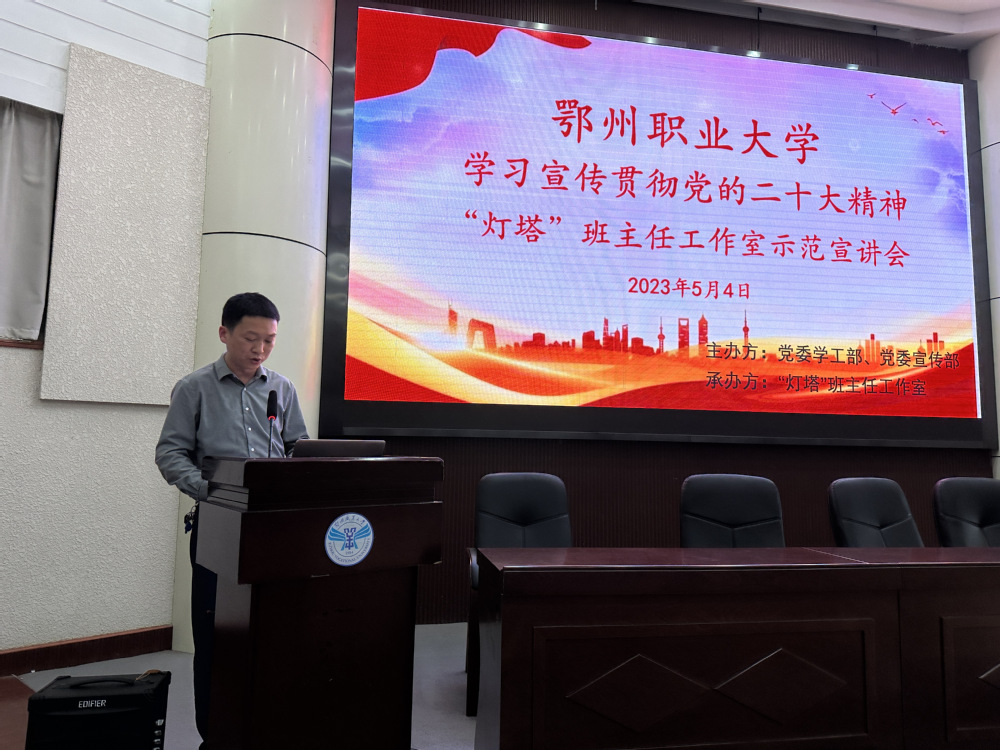 (供稿人:何青)踔厉奋发新征程,青春奋斗正当时!为展现鄂大青年蓬勃向上的精神面貌,强化对青年学生的思想政治引领,5月4日下午,由学工部、宣传部联合主办,“灯塔”班主任工作室承办的党的二十大精神示范宣讲会在图书馆二楼学术报告厅举行。党政办主任、学工部部长、各院部副书记、团总支书记、专职辅导员、各院部学生代表出席本次活动。