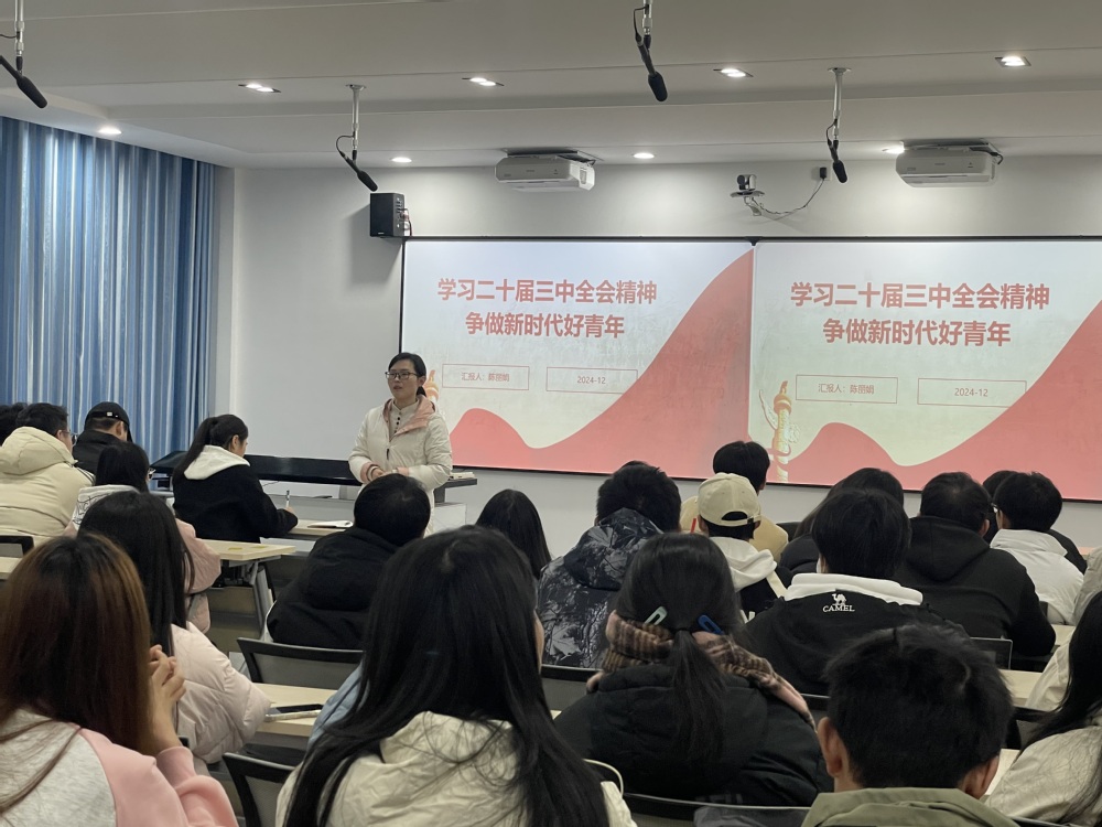 2024年12月20日晚,“灯塔”名班主任工作室成员陈丽娟老师在三号楼E508教室以《学习二十届三中全会精神,争做新时代好青年》为题进行宣讲。信息工程学院五十余名学生干部参加了此次宣讲会。