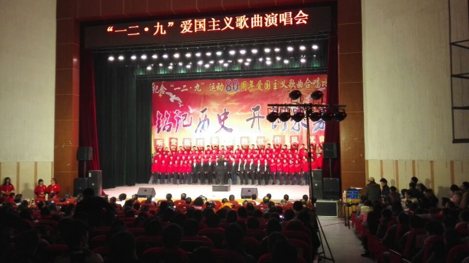 为纪念“一二九”爱国学生运动80周年,弘扬爱国主义精神。12月9日晚,在大学生活动中心我校进行了“一二九爱国主义歌曲演唱会”。