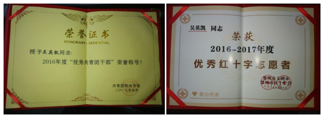 吴英凯老师被共青团鄂州市委授予“鄂州市优秀团干”称号,同时被鄂州市红十字会评为“优秀红十字志愿者”。