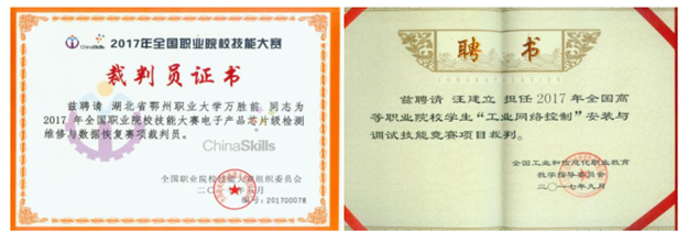 万胜前老师受聘担任全国职业院校技能大赛裁判。汪建立教师受聘担任全国工业和信息化职业教育教学指导委员会技能大赛裁判。