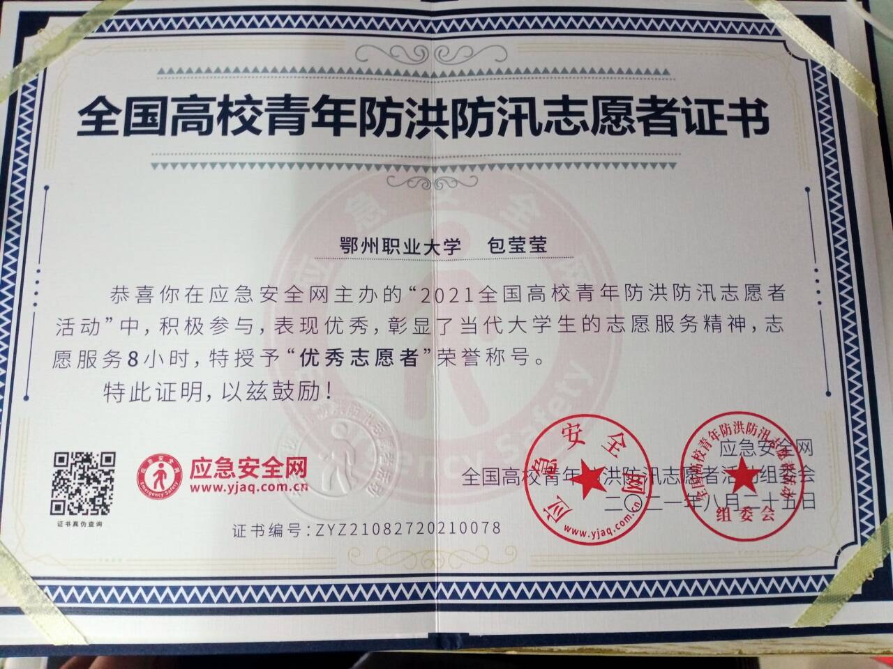 我院学生包莹莹在应急安全网主办的“2021全国高校青年防洪防汛志愿者活动”中,积极参与,表现优秀,彰显了当代大学生的志愿服务精神,被应急安全网和全国高校青年防洪防汛志愿者活动组委会授予“优秀志愿者”荣誉称号。