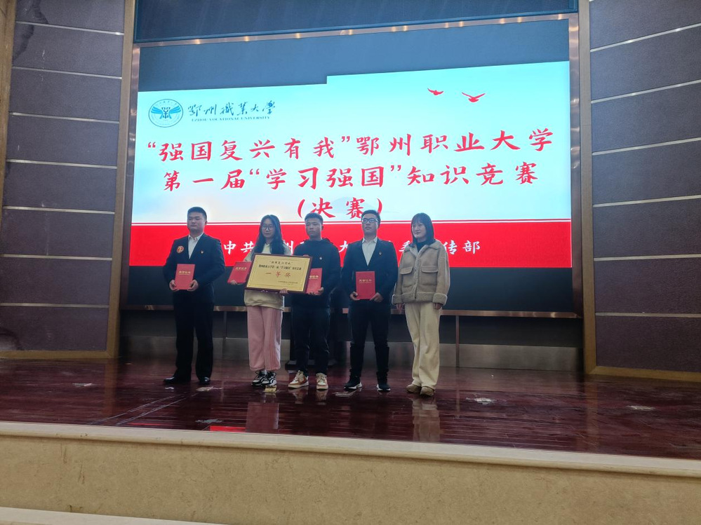 2023年2月21日,航空工程学院代表队在“强国复兴有我”鄂州职业大学第一届“学习强国”知识竞赛中,以半决赛第一挺进决赛熊扬飞、王立新、刘毅波、刘惠敏四位同学在决赛中表现优异,从全校16支队伍中脱颖而出,获得全校第一名(总冠军)!