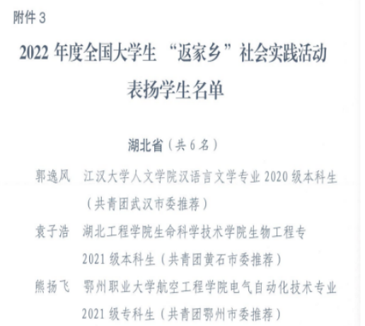(通讯员 万前锋)近日,共青团中央开展了2022年度全国大学生“返家乡”社会实践活动总结通报工作,对2022年度在活动中表现突出的单位、工作者、“返家乡”大学生、品牌项目进行通报表扬。鄂州职业大学航空工程学院2021级电气自动化技术专业学生熊扬飞,作为“返家乡”大学生,积极投身家乡社会实践,受到表扬。