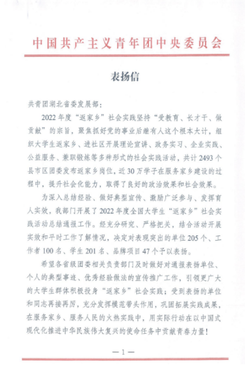 喜报!我院学生在2022年度全国大学生“返家乡”社会实践活动中获团中央表扬!