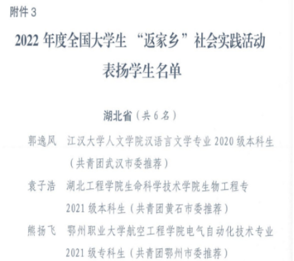 2021级学生熊飞扬获得2022年度全国大学生“返家乡”社会实践活动中获团中央提名表扬
