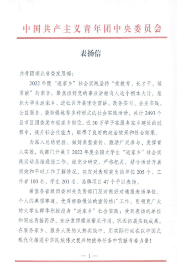 年度全国大学生“返家乡”社会实践活动中获团中央提名表扬