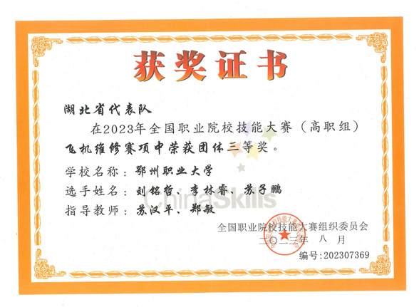 李铭哲、李林睿等同学荣获2023年全国职业技能大赛“飞机维修赛项”三等奖