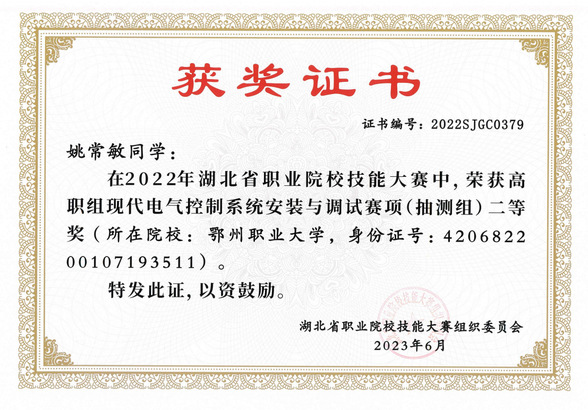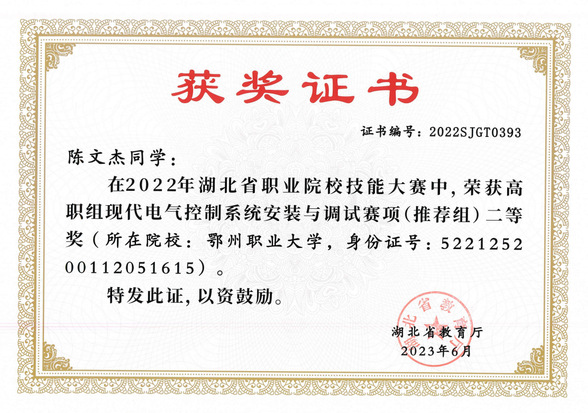 陈文杰等同学荣获2023年湖北省学生职业技能大赛“现代电气系统安装与调试”二等奖2项