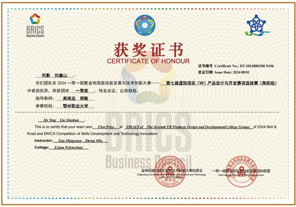 刘鑫山等同学荣获2024年一带一路暨金砖大赛之第七届虚拟现实(VR)产品设计与开发赛项选拔一等奖1项