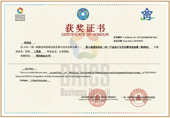 邱诗怡教师荣获2024年一带一路暨金砖大赛之第七届虚拟现实(VR)产品设计与开发赛项选拔二等奖1项