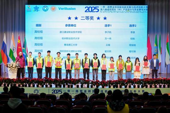 (通讯员:邱诗怡)在2025一带一路暨金砖国家技能发展与技术创新大赛第八届虚拟现实(VR)产品设计与开发赛项决赛我院师生表现亮眼。其中学生组选手李毕佳、王志龙荣获学生组二等奖;教师组高铭远、邱诗怡两位老师荣获教师组三等奖优秀指导教师称号,成功晋级2026年一带一路暨金砖大赛技术创新大赛国际赛,学校荣获优秀组织奖