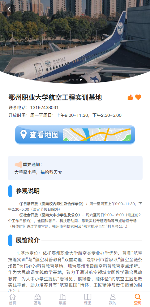 基地深耕“航空+思政”融合,已形成“蓝天绘梦师”“鄂爱科学”等特色活动。“蓝天绘梦师” 项目获省青年志愿公益项目大赛铜奖,相关活动获湖北日报、鄂州日报报道。后续,基地将进一步优化思政课程、升级实训设施、扩大校地合作,计划争创省级科普基地,持续打造“航空思政”育人样板,为服务鄂州航空枢纽建设、培养航空报国人才贡献力量。