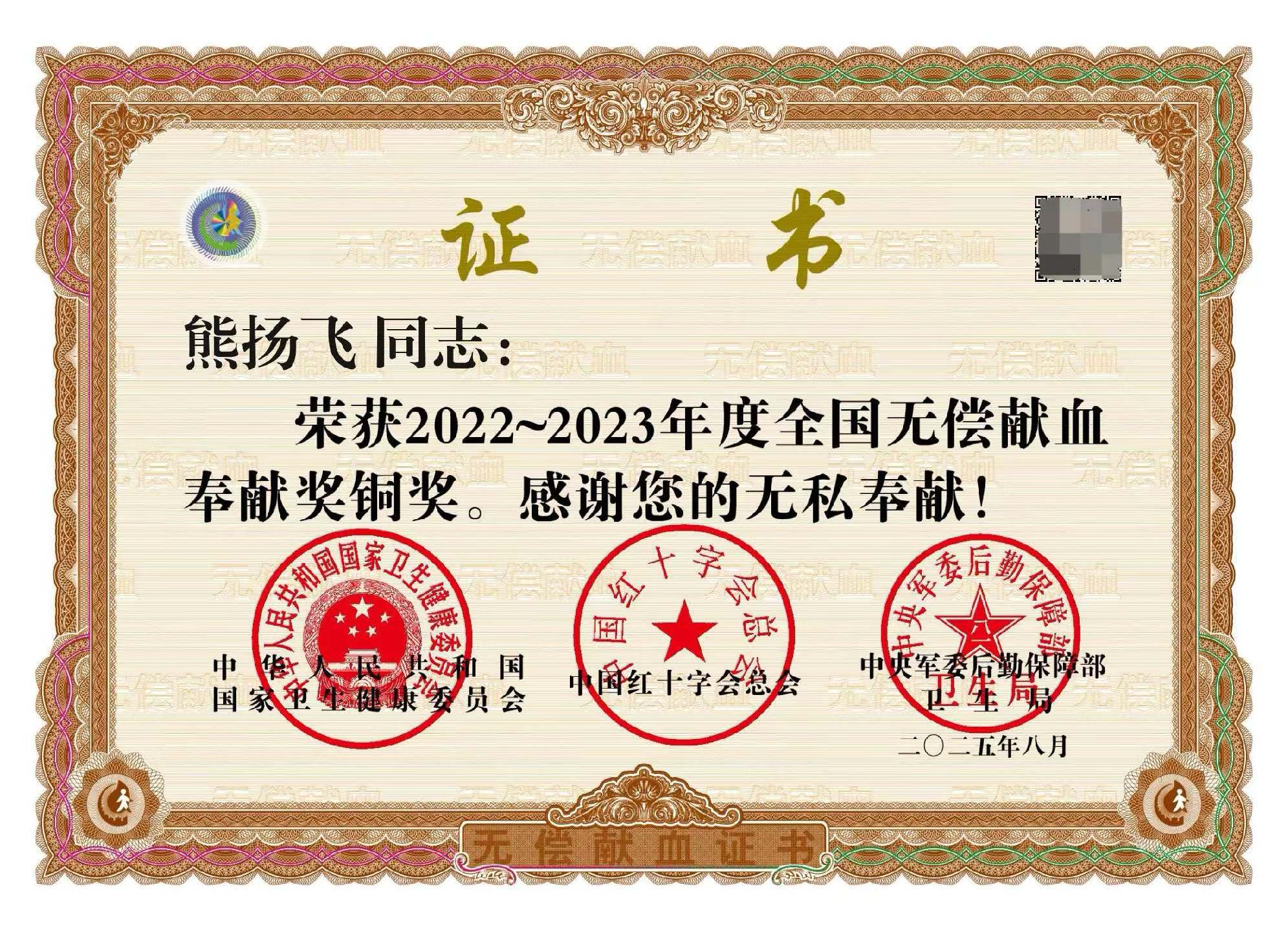 本网讯(通讯员万前锋)近日,国家卫生健康委等部门联合表彰2022-2023年度全国无偿献血奉献奖获奖者,我校航空工程学院2024届毕业生熊扬飞荣获铜奖。该奖项每两年评选一次,是国家对长期坚持无偿献血志愿者的崇高表彰。