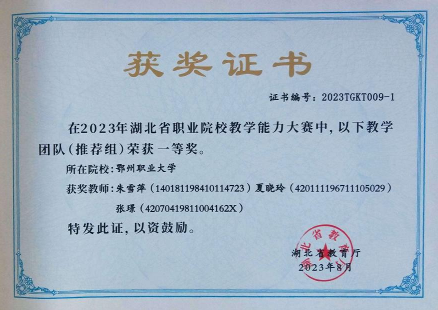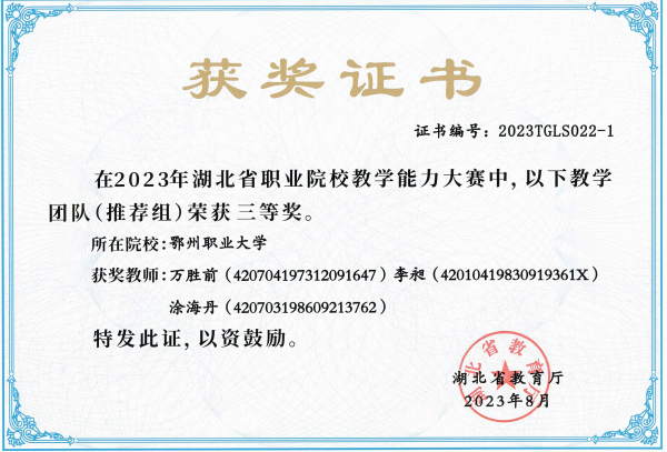 依托鄂州市劳模创新工作室,立项国家级教科研课题2项,获省级教学成果二等奖2项、省级教科研项目9项、市级41项,省级教学能力大赛一等奖1项、三等奖2项。获批实用新型专利4项,软著7项,参与国家级重点项目1项。全员参与2024年“一带一路暨金砖国家技能发展与技术创新大赛”虚拟现实(VR)产品设计与开发赛项筹备工作。