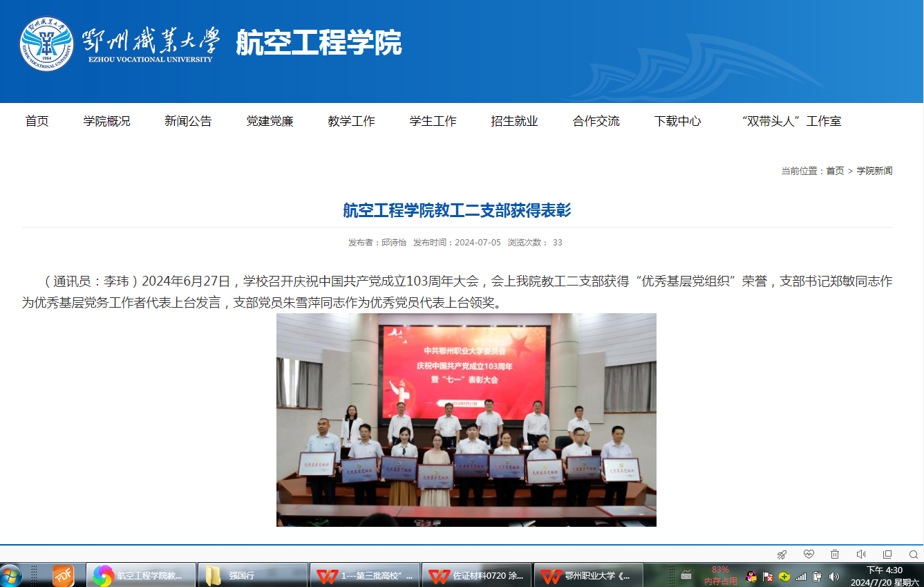 支部党员教师,以立德树人为根本任务,三年来,指导学生国家级竞赛获奖6项,省级竞赛获奖8项。学生获国家级荣誉表彰2人次,省级荣誉表彰2人次。发挥师生专业特长,开展“千针万线小家电”便民志愿服务,获2022年湖北省新时代文明实践志愿服务项目大赛银奖1个,面向鄂州市民开展航空科普教育公益活动2000人次。