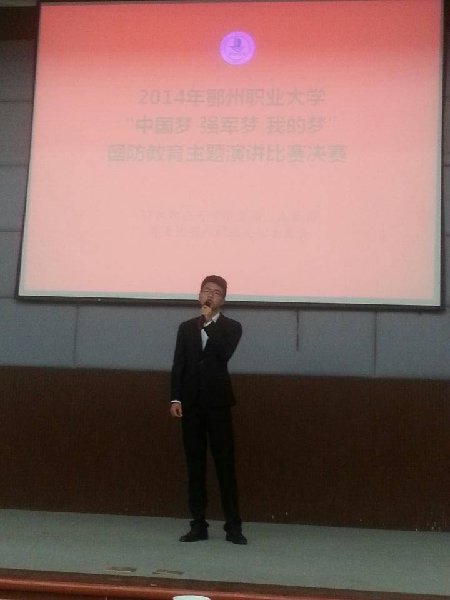 10月22日下午,2014年鄂州职业大学“中国梦 强军梦 我的梦”国防教育主题演讲比赛决赛在学校图书馆2楼学术报告厅隆重举行,中职学院学生会副主席、13级学前教育3班学生刘旺和14级学前3班宁迩楠同学代表学院参加了比赛,凭借其优异表现,分获决赛三等奖和优秀奖。