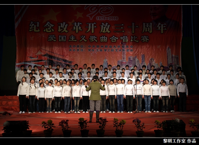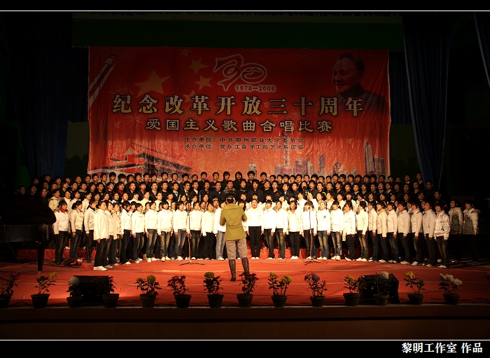 为隆重纪念我国改革开放30周年,讴歌社会发展的辉煌成就,12月8日晚,由我校党委主办,党办、工会、学工处、艺术系、团委五个部门共同承办的“鄂州职业大学纪念改革开放30周年爱国主义歌曲合唱比赛”于艺术楼礼堂隆重举行。副市长李莹、市委宣传部副部长熊友云、市政府副秘书长胡楚平、团市委书记黄立楣莅临观看,校党委书记彭有轩致开幕词。
